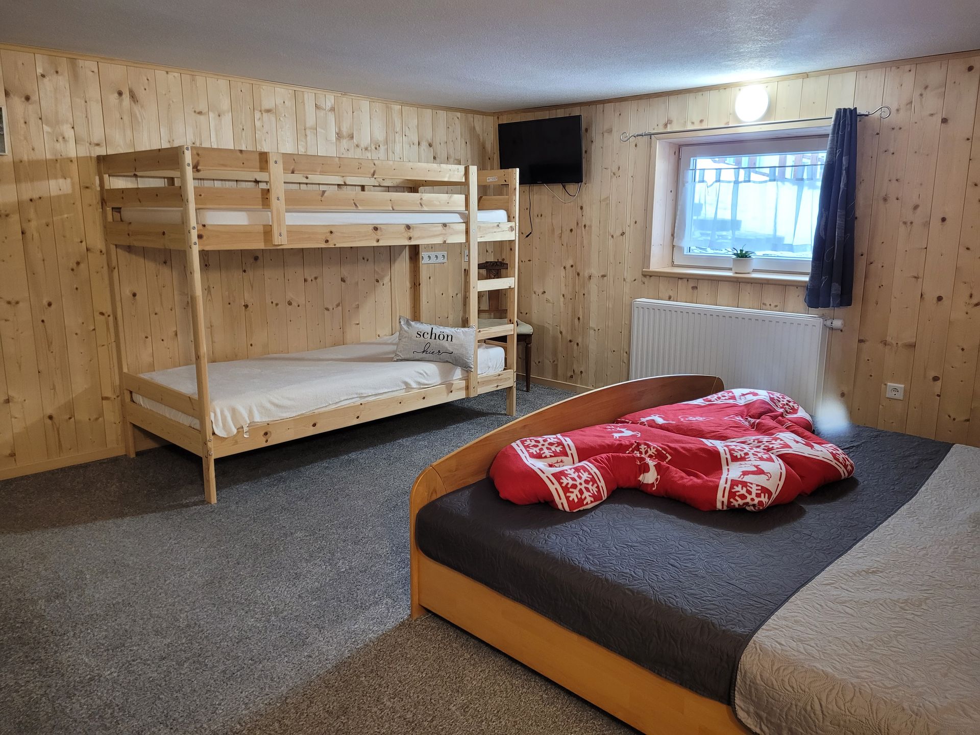 Dieses Appartement erstreckt sich über zwei Etagen und bietet Platz für 2 bis 5 Personen. Es verfügt über ein Schlafzimmer mit Doppelbett und Stockbett, welches über eine steile Treppe erreichbar ist. Zudem befinden sich ein Badezimmer, Wohnzimmer mit Schlafcouch und eine Küche in der Ferienwohnung. Besonders geschätzt wird der Balkon mit herrlichem Bergblick.